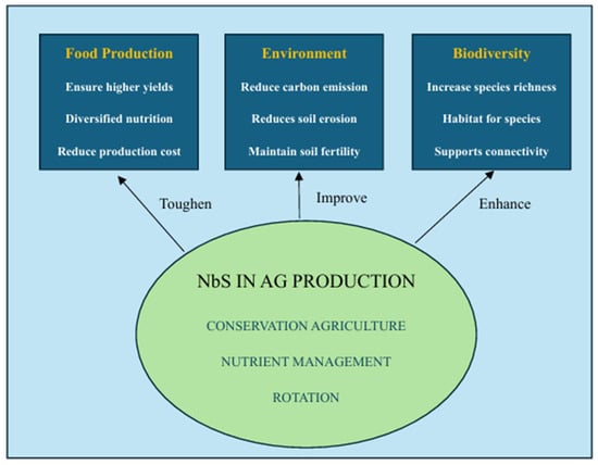 Nature-based solutions (NbSs) are increasingly being advocated in both research and policy circles as one of the possible means to support future food systems and facilitate a sustainable shift in agricultural production []. NbSs encompass strategies aimed at protecting, managing, or restoring natural environments while also enhancing ecosystems to address societal challenges. These approaches include utilizing nature for adaptation purposes, implementing natural climate solutions, and incorporating green infrastructure []. The primary goal of all NbS initiatives is to enhance nature’s capacity to provide essential ecosystem services that effectively address human concerns such as adapting to climate change, ensuring food security, and mitigating the risks associated with disasters []. Many NbSs are directly applied in agricultural production and management, such as conversion agriculture and cropland nutrient management. Farmers or producers primarily implement these technologies, which may bring direct economic benefits, such as increased production or reduced costs, along with broader social benefits [,]. As shown in Figure 1, agricultural NbS technologies can play a crucial role in ensuring food security [], addressing climate change [], and enhancing natural biodiversity [] in the long term.