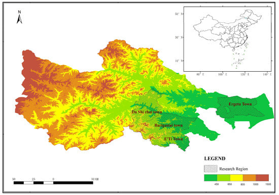 This paper proposes a combination of typical sampling and stratified random sampling to minimize sampling bias and enhance the representativeness of the study sample. Although several counties in Northeast China are well-suited for promoting agricultural NbS technology, the lack of clear support from many local governments could introduce sample selection bias. To address this, typical sampling techniques were employed to choose the sample counties. Horqin Right-Wing Front Banner was selected because the proportion of maize and soybean cultivation (77%) closely matches that of Northeast China (78%), with comparable agricultural production conditions []. Despite research constraints limiting the sample area to Horqin Right-Wing Front Banner, it is believed that this choice provides a level of representativeness for the promotion of NbS technology in the region. For stratified random sampling, three agricultural towns and one agro-pastoral town in Horqin Right-Wing Front Banner were selected based on their agricultural production conditions and ecological zone diversity. The selected towns include E’ti, Barigastai, E’ergetu, and Dashizhai (Figure 3). In each town, at least four villages were chosen, and from each village, a minimum of 20 sample farmers were randomly selected, resulting in a total sample of 300 households.