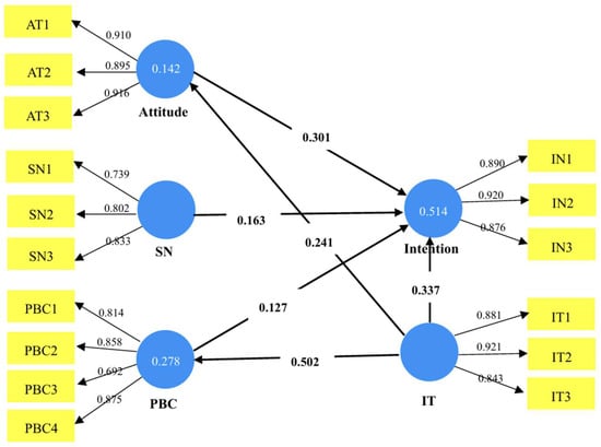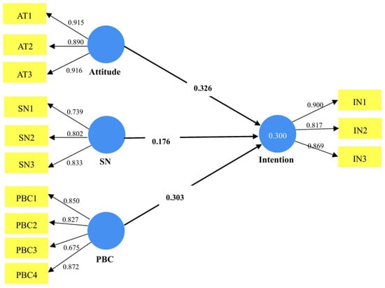 Recently, concerns have been raised regarding the reliability of the Fornell–Larcker criterion in ensuring discriminant validity. Consequently, a new criterion called heterotrait–monotrait ratio of correlations has emerged. Table 7 presents values for Average Variance Extracted, Composite Reliability (CR), and Cronbach’s Alpha (α). All extracted values surpass the recommended thresholds of 0.5, 0.6, and 0.7 respectively [,,], indicating sufficient convergent validity and reliability for all latent variables in our proposed model.As demonstrated in Table 7, all HTMT values were below the threshold (HTMT.85), thereby confirming no issues with discriminant validity [,]. Moreover, upon reviewing the model fit indices, both the original TPB and extended TPB models exhibited favorable fits. This assessment is further supported by meeting the criteria thresholds: SRMR < 0.10, D_G1 > 0.05, D_G2 > 0.05, NFI > 0.90, and RMS_Theta ≤ 0.12; indicating acceptable levels of fit were achieved. Additionally, it appears that the extended TPB model displayed a more appropriate level of fit compared to its initial counterpart in this study.