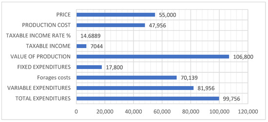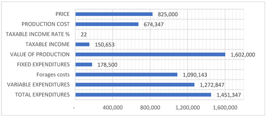 Based on the estimated average yields under climate change conditions for ration forages, the areas required for fodder cultivated on the farm were calculated. The income and expenditures budget was drawn up, with the components of variable expenditure (feed, biological material, energy, medicines, other material expenditure, and supply quota) and fixed expenditure (labor, general expenditure, interest, and amortization) as well as with the component of income indicators: value of production, value of main production, taxable income, net income, and income rates, following the formulas described below: