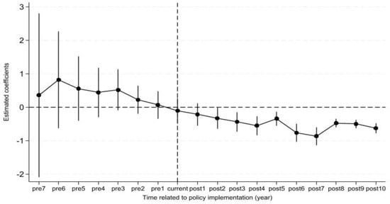 The parallel trend test is an prerequisite for the DID model [36], that is, it helps to ensure that the carbon emissions in both the control group and the experimental group remain relatively parallel without significant difference before the implementation of the HSFC policy. Thus, this study uses the event study method to test the parallel trend as shown in Figure 1, which shows that the estimated coefficient values are not statistically significant before the HSFC policy implementation (pre7-current), and the estimated coefficients all contain 0 values within the 95% confidence interval. This indicates that there is no significant difference in agricultural carbon emissions between the regions with relatively high land regulation area (with HSFC) and regions with relatively low land regulation area (without HSFC), which passes the parallel trend test.