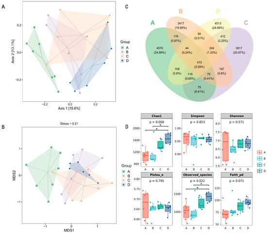 Effects of dietary supplementation with EDP on cecal microbial community composition and diversity in Sanhua goslings. (A) Principal Coordinates Analysis (PCoA) showing differences in microbial community composition among different groups. (B) non-metric multidimensional scaling (NMDS) based on Bray–Curtis distance showing microbial community structure differences among different groups. (C) Venn diagram showing the number of shared and unique Operational Taxonomic Units (OTUs) among different groups. (D) Alpha diversity box plots including Chao1, Simpson, Shannon, Pielou_e, Observed Species, and Faith_pd indices. Note: Asterisks (*) indicate statistically significant differences between groups. p < 0.05 is indicated by *.