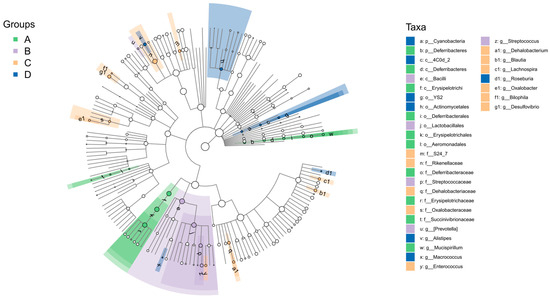 LEfSe cladogram showing differentially abundant microbial taxa among groups.