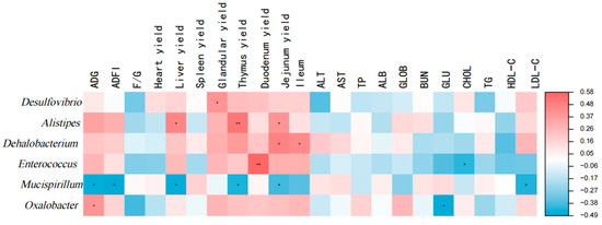 The findings from the correlation analysis are displayed in Figure 5. Desulfovibrio exhibited a significant positive correlation with the relative weight of the glandular stomach (p < 0.05). Alistipes demonstrated a significant positive association with the relative weights of the liver, thymus, and jejunum (p < 0.05). Dehalobacterium showed a significant positive correlation with the relative weights of the jejunum and ileum (p < 0.05). Enterococcus exhibited a significant positive association with the relative weight of the duodenum and a negative correlation with serum CHOL levels (p < 0.05). Mucispirillum exhibited a significant negative correlation with ADG, ADFI, and LDL-C levels, as well as with the relative weights of the liver, thymus, and jejunum (p < 0.05). Oxalobacter exhibited a strong positive correlation with ADG and an inverse correlation with serum GLU levels (p < 0.05).