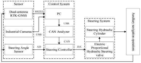The structure of the auxiliary navigation control system for rotary burying and returning to the field operations is shown in Figure 2, which is mainly composed of four parts: Dongfanghong LX954 power equipment, sensor, control system, and steering system. The auxiliary navigation control system obtains the position status information of the operating unit and field environment information through the sensors, and the control system controls the steering system to realize the auxiliary navigation operation according to the incoming information from the sensors.