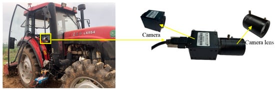 The hardware used for the sensors includes an industrial camera (VCHY300 color industrial camera, Micro Valley Technology, Luoyang, China), a steering angle sensor (ANG1 series non-contact angle sensor, range −45°~45°, accuracy 0.05%, resolution 0.025%, Luoyang Mita Electric Control Technology, Wuhan, China), and an RTK-GNSS positioning system (K726-OEM type). Other parameters include a dual-antenna satellite positioning and orientation system, plane accuracy of 1 cm, elevation accuracy of 2 cm, and a heading angle accuracy better than 0.2°/R (R is the length of dual-antenna baseline, m), (Shanghai Sinan Satellite Navigation Technology Co., Shanghai, China). The industrial camera is equipped with a fixed-focus low aberration industrial 6 MM lens to acquire working picture information in real time, which is installed on the right side of the tractor, maintaining the same heading as the vehicle, and acquires the field boundary information as shown in Figure 3. The specific parameters of the camera lens are shown in Table 2, and the specific parameters of the industrial camera are shown in Table 3. From the parameters, it can be seen that the industrial camera has an adjustable focal length, an exposure time that can be set artificially, and a certain anti-noise performance, which can effectively reduce the influence of the complex environment in the outdoor field shooting and obtain accurate field image information; the positioning and directional antennas of the mobile station of the RTK-GNSS positioning system are placed on the left and right sides of the rear part of the roof of the tractor, respectively (the length of the baseline is 1.38 m), the positioning antenna of the base station is installed on the roof of the Rice and Aquatic Vegetable Laboratory of Huazhong Agricultural University, and the U300 radio module and the high-power CDL5 radio are used to realize the real-time acquisition of accurate differential positioning, orientation, and roll angle information of the operating unit within a range of up to 3 km in real time. The controller mainly consists of an onboard computer (Win10 system laptop computer, Intel(R) Core(TM) i7-7500U CPU @ 2.70 GHz 2.90 GHz and 8 GB RAM, Dell), a CAN analyzer (USBCAN/CANalyst-II, Zhuhai Chuangxin Technology, Zhuhai, China), and a steering controller. The above sensors can be adapted to the outdoor farm environment.