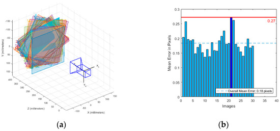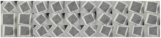 In order to obtain the internal parameter information of the camera for calibration, this paper uses a 16 × 16 black and white checkerboard grid as the calibration plate of the camera for calibration, and the length of a single small checkerboard grid is 15 mm. In total, 30 calibration images are acquired in this paper as shown in Figure 4. The calibration images are imported into the Camera Calibrator toolbox in MATLAB2019a for the pinhole model camera calibration, and the calibration results are shown in Figure 5; the toolbox can obtain the relative position map of each calibration plate to the camera and the overall reprojection error and the internal parameters of the camera as shown in Table 4.
