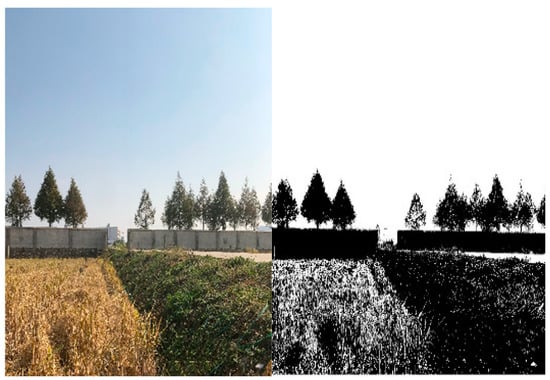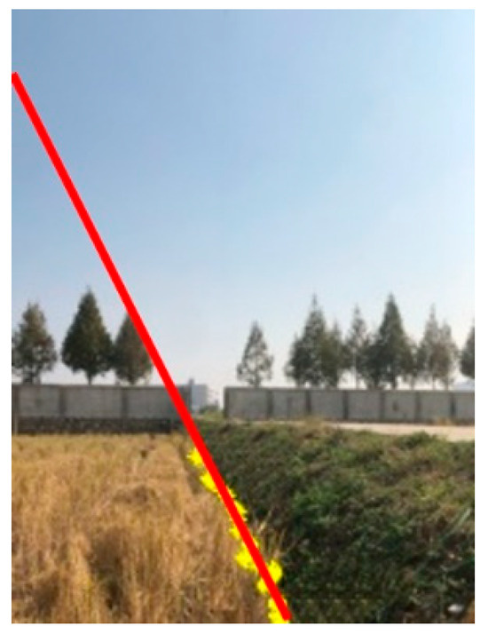 Rice post-harvest residues and stubble are more concentrated in the H domain, and the hue H component is independent of the luminance V component so that the H component is adaptable to the effects caused by shadows and uneven illumination in the image. It is known through the test statistics of the trial-and-error method that when the hue H is between the upper limit Hmax = 0.118 and the lower limit Hmin = 0.22, it can accurately distinguish the rice stubble after harvesting from other environments, such as the surrounding field mounds, as shown in Figure 9. In this paper, the selection of the hue H component can effectively segment the boundary features of the post-harvest rice fields and meet the recognition requirements of the starting route of the rotary burying.