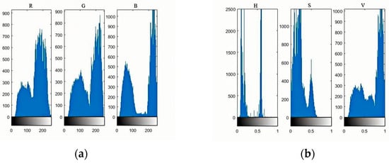 Histograms of RGB and HSV models. (a) RGB components. (b) HSV components.