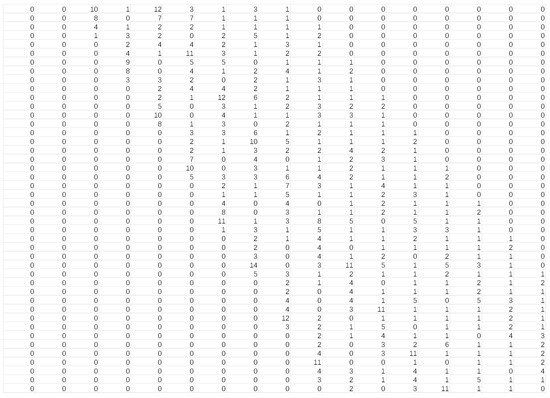 For every slope and intercept value that agrees with the elements of array A(a, b), the corresponding array value is increased by 1, i.e., A(a, b) = A(a, b) + 1. After all the operations are completed, the largest peak value of A(a, b) is found in the result of the parameter computation vote, and the corresponding a0 and b0 values are the slopes and intercepts of line equations for the line segments with the most covariant target points (a total of A(a, b) covariant points) in the original image. Other sub-peak points correspond to the slope and intercepts of line segments with slightly fewer covariant points in the original image’s intercept; the other sub-peak points correspond to the slopes and intercepts of the line segments with slightly fewer co-linear points in the original image. The final partial Hough matrix obtained after accumulation is shown in Figure 15.