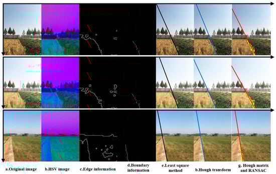 Images of outdoor fields with different lights in different scenes were collected to verify the effectiveness of the algorithm. Scene 2 has a different light intensity from scene 1, and scene 3 is a different field scene. Under the conditions of different backgrounds, the light intensity and color temperature are different, so, in this study, the trial-and-error method is used to obtain the appropriate threshold of 0.15~0.42 for the H component. As shown in Figure 19, because the Hough transform method is more concerned about the uniform covariance of the local feature points in detecting the line features, some of the regional points in the path become separate lines, and thus, the error of the path obtained by the Hough transform method is larger. Compared with the Hough transform, the least squares method can obtain incomplete linear equations. The least squares method is a direct global minimum derivation, which has better global properties, but it is also susceptible to the influence of error points. In this study, redundant points are first eliminated using the Hough matrix and then outliers (error points) are eliminated using the RANSAC algorithm. Finally, as can be seen in Figure 19, the path fitting of the Hough matrix and RANSAC can reflect the information of field boundaries more comprehensively, and the experimental results using different backgrounds show that the method can accurately obtain the starting routes in different backgrounds and has strong robustness.