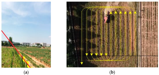 In order to ensure the quality of rotary burying and returning to the field operations, this article sets the operating speed of the tractor to about 0.61 m/s, equipped with two sets of RTK-GNSS systems, with a satellite acquisition frequency of 10 Hz. One set provides real-time monitoring of surface height changes to provide input signals for controlling tillage depth changes, and the other set monitors the height changes in the rotary burying machine in real time. The experimental steps are as follows: (1) The status of the work tools is checked to ensure that the path tracking system and plowing depth control system are working properly. (2) The heading of the assigned unit is adjusted to the due north direction, the field boundary starting route recognition system is activated to obtain the starting route of the rotary burying and returning operation, and the maximum number of crossings is planned for the loop-shaped nesting path. Figure 20a shows the result of extracting the starting route through the Hough matrix and RANSAC algorithm.