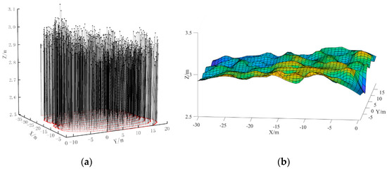 Figure 21 shows the results of the variable-gain single-neuron PID path tracking navigation control system and variable-gain single-neuron PID tillage depth control system tests. Due to the wet and soft soil at the time of harvesting, there were not only a large number of bumps caused by piling up after the harvesting operation but also a large number of potholes in the field left by the traveling harvester. Finally, as shown in Figure 21a, the three-dimensional trajectory of the operation was completed, and the height of the ground surface varied irregularly within the range of 2.714~3.119 m during the rotary burying operation. The geomorphologic surface of the field as shown in Figure 21b can be obtained by linearly fitting the operation trajectory and the corresponding height points.