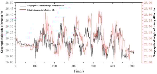 As can be seen from the three-dimensional diagram of the trajectory of the rotary burying and returning operation, the variable-gain single-neuron PID path tracking control algorithm controls the steering of the entire rotary burying operation unit to realize the auxiliary navigation operation in the whole operation process. In the rotary burying operation, the rotary burying and returning operation machine uses a variable-gain single-neuron PID tillage depth control system to control the height of the tractor’s rear suspension to realize adaptive control of the tillage depth operation when the operation field is running. However, in the field head turning area, the electronically controlled hydraulic tillage depth control system will raise the rotary burying operation machine by 15 cm; the specific field rotary burying operation when the height changes between the tractor and the operation machine is shown in Figure 22.