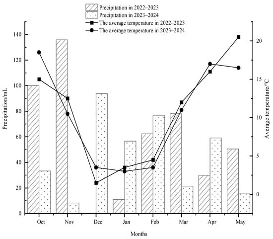 The soil texture of the test site was clay loam, and the previous crop was corn. All the phosphorus and potassium fertilizers in the two growing seasons were applied at 90 kg ha−1 for basal fertilization. The nutrient content of the 0–20 cm soil tillage layer is shown in Table 1. Soil nutrient content was determined according to the Rogers method [20]. The average temperature and precipitation in the growing seasons are shown in Figure 1.