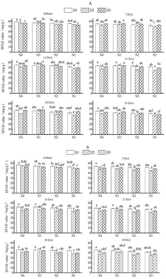 Relative chlorophyll content of wheat at different densities and levels of nitrogen supplementation. Note: N1, N2, N3 and N4 indicate the N rate of 37.8, 43.2, 48.6 and 54 kg N ha−1, respectively. D1, D2 and D3 indicate the plant density of 180, 240 and 300 × 104 plants ha−1, respectively. The relative chlorophyll content of each treatment in 2022~2023 (A); the relative content of leaf green in each treatment in 2023~2024 (B). Different lowercase letters in the figure indicate that the LSD test was significantly different at the 0.05 probability level. DAA, days after anthesis.