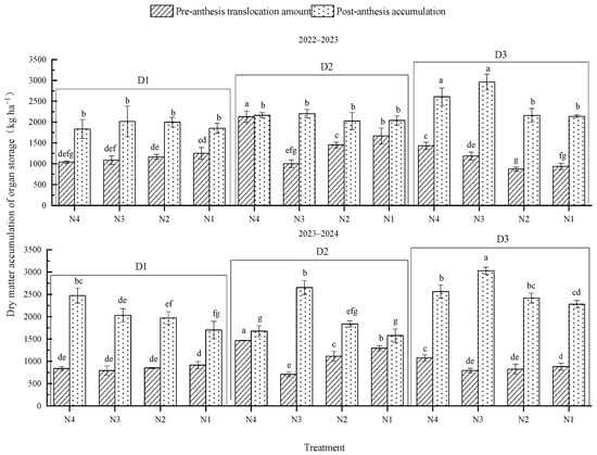 Organ accumulation in wheat at different densities and levels of nitrogen supplementation. Note: N1, N2, N3 and N4 were 37.8, 43.2, 48.6 and 54 kg N ha−1, respectively. D1, D2 and D3 represent the plant density of 180, 240 and 300 × 104 plants ha−1, respectively. Different lowercase letters in the figure indicate that the LSD test was significantly different at the 0.05 probability level.