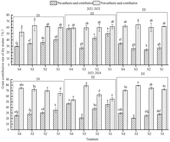The contribution rate of wheat grain under different densities and nitrogen topdressing levels. Note: N1, N2, N3 and N4 were 37.8, 43.2, 48.6 and 54 kg N ha−1, respectively. D1, D2 and D3 represent the plant density of 180, 240 and 300 × 104 plants ha−1, respectively. Different lowercase letters in the figure indicate that the LSD test was significantly different at the 0.05 probability level.