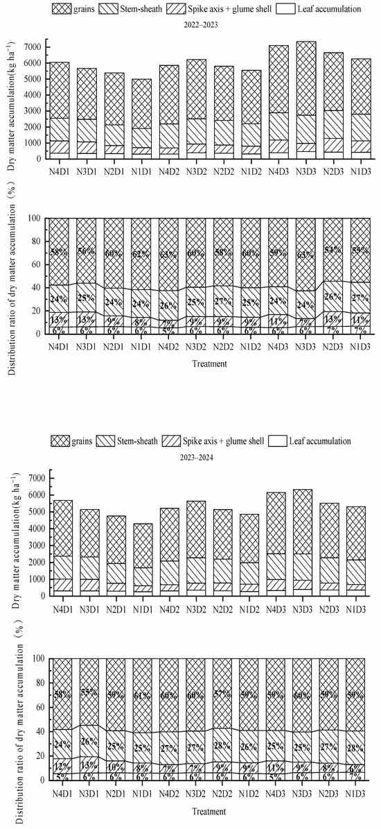 Nitrogen supplementation and density had significant effects on the accumulation of leaf dry matter, stem sheath dry matter, rachis + glume dry matter and seed dry matter in different years (Figure 5). There were significant effects of nitrogen and planting density on the dry matter accumulation in the leaf, stem sheath, rachis + husk and grain in different years. The dry matter accumulation and distribution ratio in all organs at maturity in both years was of the order kernel > stem sheath > rachis + glume > leaf. At the same density, the dry matter accumulation in the leaves and kernels showed an overall increase followed by a decrease with nitrogen reduction. Both had the largest dry matter accumulation of kernels at the N3 level, and the pattern was consistent across years. At the same level of N application, the dry matter allocation of leaves, stem sheaths and grains increased overall with increasing density, and all showed the greatest accumulation of dry matter in grains at the D3 level, with a consistent pattern across years. Among them, the amount of dry matter allocated to kernels was larger under N3D3 treatment, and the pattern showed consistency between years. This indicates that the optimal nitrogen density combination is conducive to reducing the premature senescence of nutrient organs, increasing the proportion of grain dry matter accumulation, thus increasing grain yield in wheat.