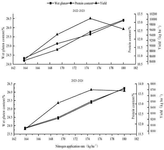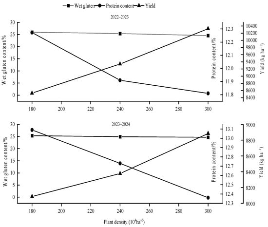 Wheat is one of the important food crops in China. It plays a crucial role in ensuring national food security, accounting for approximately 11% of the total food consumed by humans [1]. The middle and lower reaches of the Yangtze River form the core area for producing weak-gluten wheat. The region is rich in heat, light and water resources, making it conducive to the production of weak-gluten wheat [2]. Weak-gluten wheat has low protein content and hardness. It is used as a raw material for making biscuits, cakes and other light-textured baked goods [3]. Increasing demand for cakes, driven by improved dietary habits, has led to a shortage of high-quality weak-gluten wheat for domestic supply [4]. Nitrogen application and planting density are key cultivation factors for achieving high yield and quality of wheat [5]. Optimal nitrogen application and planting density in wheat improve yield and quality synergistically, whereas excessive nitrogen application and high planting density increase the plant population and effective tillers, leading to reduced field ventilation and light transmission that ultimately reduces spike rate and affects yield [6,7]. Therefore, developing high-yield and high-quality weak-gluten wheat is essential to meet per capita consumption needs in China.