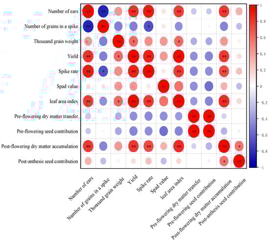 The yield was significantly positively correlated with the panicle number, panicle rate, LAI and dry matter accumulation after anthesis, and significantly positively correlated with the panicle rate (Figure 7). There was a significant positive correlation between the spike number and spike rate. These findings indicate that the population structure of wheat can be improved by adjusting the number of spikes, thereby promoting the formation of spikes, and coordinating the competition among populations to increase the LAI and dry matter accumulation after anthesis, thereby increasing grain yield.