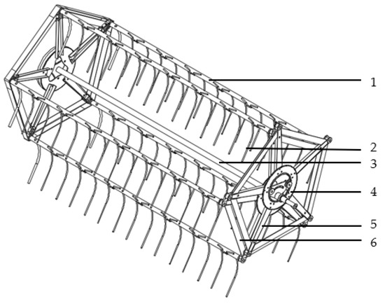 Structurally, reels can be classified into two types. The first is the conventional reel, which features a simple design but has limited adaptability to different crops, resulting in suboptimal harvesting performance. As a result, this type is gradually being phased out [24]. The second type, shown in Figure 1, is the eccentric reel, which is widely used in modern combine harvesters. The design parameters of the eccentric reel include the reel diameter, main shaft diameter, rotational speed, and tube shaft diameter. Additionally, the installation position of the reel must be carefully considered during assembly.