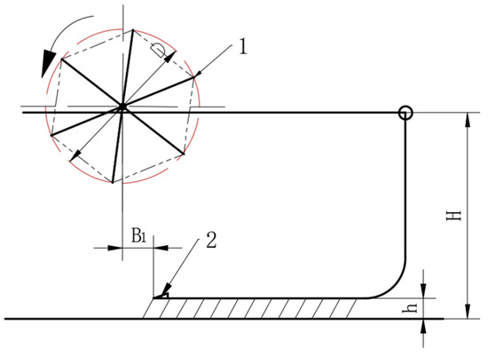 In Figure 2, represents the installation height of the reel, denotes the forward extension length from the center axis of the reel to the cutter, and h indicates the stubble height. The forward extension amount of the combine harvester’s reel can be determined using Equation (3).