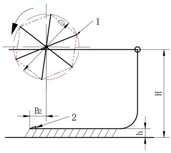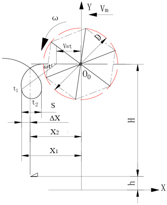 where, is the time the reel vertically inserts into the crop mass (s), and is the time when the reel’s action concludes (s); is the distance from the reel’s center axis to the point of action when the reel is vertically inserted (mm); is the distance from the reel’s center axis to the point of action when the reel’s action ends (mm); and represents the effective range of the reel’s action (mm).