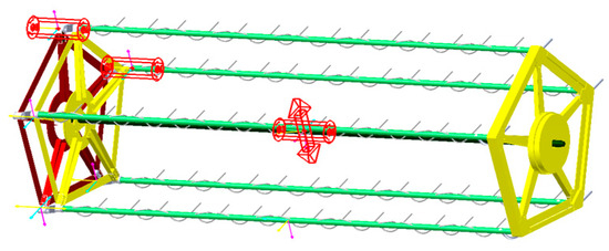 The 3D model of the reel created in SolidWorks was imported into RecurDyn 2023 (FunctionBay, Seongnam-si, Gyeonggi-do, Republic of Korea) software for kinematic simulation analysis to evaluate the feasibility of the designed reel structure [28,29]. To reduce the workload in subsequent simulation processes, all bolts, bearings, and various connectors and constraints within the reel were removed, allowing each component of the reel to function as independent parts.