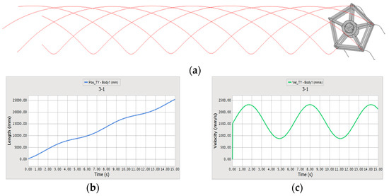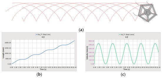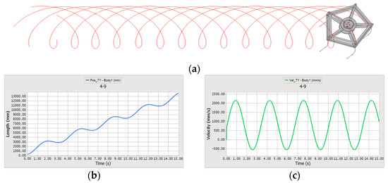 Reel movement status with = 1. (a) Motion trajectory of the reel arm; (b) Horizontal displacement curve of the finger bar ends; (c) Horizontal velocity curve of the finger bar ends.