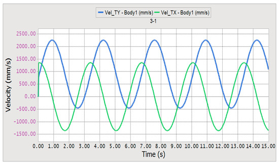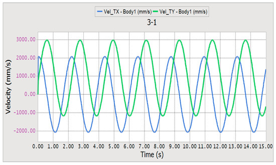 From the analysis in the previous section, it can be concluded that the speed ratio (λ) had a significant effect on the header loss rate of the millet combine harvester. The simulation analysis shows that when λ > 1, the trochoidal trajectory of the reel can provide a backward driving force, effectively guiding the cut millet stem into the cutting table, and significantly reducing the loss rate. When λ ≤ 1, due to the lack of backward speed, the supporting effect of the reel is insufficient, resulting in an increase in the grain header loss rate. However, to further minimize the header losses of the combine harvester during the foxtail millet harvesting process, it is essential to identify the optimal speed ratio for millet effective harvesting. The ends of the finger bars of the reel are selected as observation points to analyze their velocity variation curves at different reel speed ratios. The results of this analysis are presented in Figure 8 and Figure 9.
