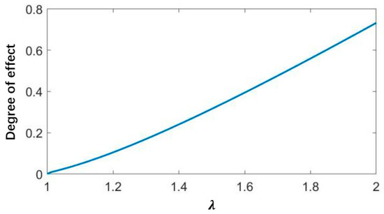 Equation (11) was imported into MATLAB 2020 (MathWorks, Natick, MA, USA) software for curve plotting to identify the relationship between the effectiveness of the grain separator and the speed ratio , as shown in Figure 11. It can be observed from Figure 11 that the effectiveness increases continuously with the value of the speed ratio . For common crops such as rice and wheat, the effectiveness of the reel under normal operating conditions should be approximately 0.3 [34,35]. As the effectiveness increases, with the value of continuously rising, the impact of the reel on the crops is intensified, leading to greater potential grain header losses.