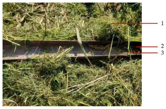 The field performance test of the millet combine harvester primarily referenced the ‘Technical Specifications for Quality Evaluation of Grain Combine Harvesters’. The grain header loss was measured using the sample trough method. Based on the cutting width of the combine harvester, the sample troughs were designed with a length of 2200 mm, a width of 200 mm, and a total of three troughs. Prior to harvesting, trenches with the same dimensions as the sample troughs were dug in the test field, perpendicular to the harvester’s forward direction. The trench depth was either equal to, or slightly greater than, the sample trough to prevent the trough from being crushed by the combine harvester during operation [35], as shown in Figure 13.