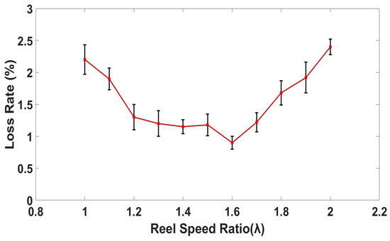 The millet grain header loss rate was obtained based on Equation (12), as shown in Figure 14.