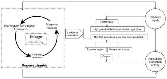 39]. The use of these intermediate consumables generates problems such as wastewater, exhaust emissions, and noise pollution. These issues have a negative impact on the surrounding environment. In summary, this paper identifies six factors from three levels of spatial mismatch: capital, labor, and intermediate consumption. These factors are used as conditional variables for qualitative comparative analysis. The six factors are labor, capital, agricultural diesel, pesticides, mulch, and fertilizers. The outcome variable is the improvement in green total factor productivity (GTFP) in agriculture. The theoretical analysis framework is illustrated in