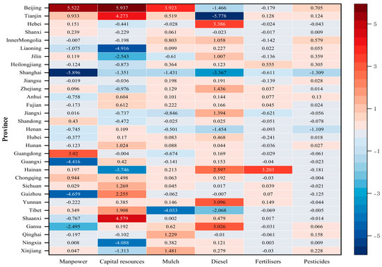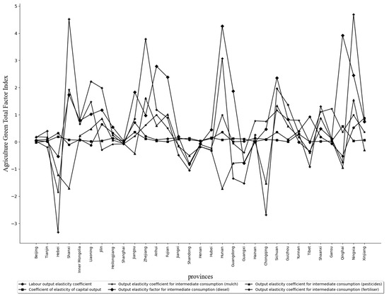38]. The spatial mismatch of intermediate consumption negatively impacts green total factor productivity. Agricultural diesel, fertilizers, pesticides, and mulch are the main sources of carbon emissions in agricultural production [