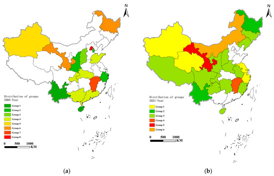 49]. The reasons for this include high capital investment in agricultural production and low usage costs, as well as a high level of agricultural development and abundant manufacturing resources in these regions. During the transformation from traditional to modern agriculture, these regions have unique advantages and a solid foundation for agricultural development. The allocation of capital resources and mechanization has significantly increased the green total factor productivity of agriculture in these regions. Group 4 is mainly capital-driven. The representative regions in 2005 include the Xinjiang Uygur Autonomous Region, which benefited from the “Western Development” policy implemented by the Chinese government and financial support, such as interest rate reductions. Additionally, since the land in Xinjiang is saline, capital investment has increased land output. In 2021, the representative provinces include Tianjin, Shaanxi, and 15 other provinces (