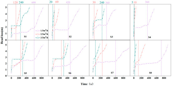 3.1. Changes in Head Loss of Drip Irrigation Filters with Clear Water