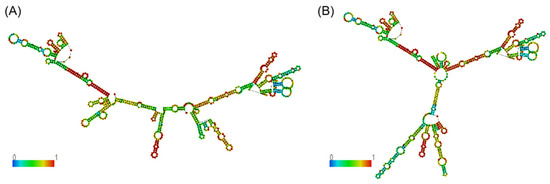 In addition, the secondary structure of mRNA not only directly affects the stability of its own structure but also regulates biological processes such as the initiation of RNA translation, the extension and speed of the translation process, and the folding of post-translated proteins by influencing the function of the higher structures of RNA [31,32]. In this study, we observed that allele A of rs110098953 in APOM and allele A of rs378530166 in CYP7A1 resulted in more stable mRNA secondary structures compared to allele G, respectively, as evidenced by their lower MFEs. However, individuals with genotype AA for these two SNPs exhibited significantly higher fat yield, fat percentage, and protein yield compare to those with genotype GG. It is possible that other complex factors in the transcription process contributed to these results.