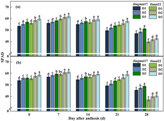 Flag leaf SPAD value after anthesis for different treatments in 2021–2022 (a) and 2022–2023 (b) growing seasons. Different small letters indicate significant differences at 0.05 level. D1: October 13; D2: October 23; D3: November 2. The same as Figure 3, Figure 4, Figure 5, Figure 6, Figure 7, Figure 8 and Figure 9.
