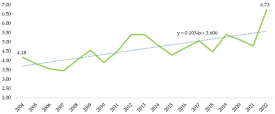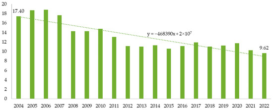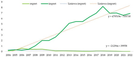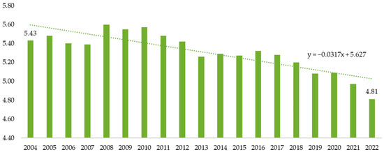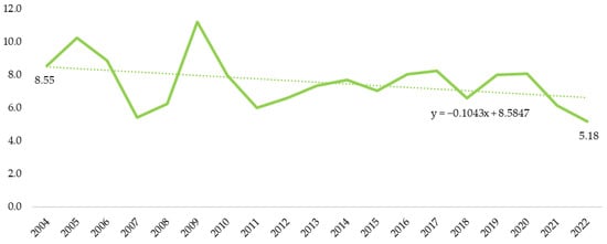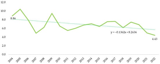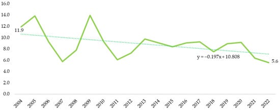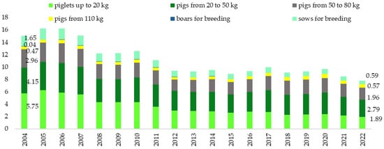 Pig population in Poland in 2004–2022 (million heads). Source: Authors’ own study based on the Local Data Bank, Statistics Poland.