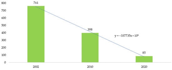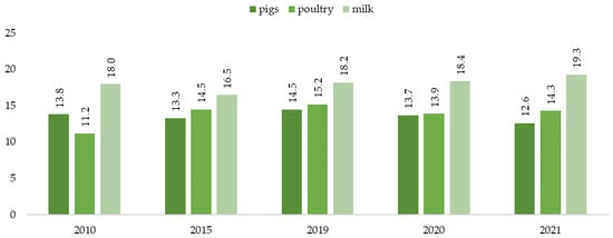 According to Pepliński [], the decline in the importance of live pigs is related to the slower pace of price growth compared with other products and the growing sales of grains, which results from the concentration of poultry and pig production (fewer and fewer farms use grains for feed). A sharp reduction in the pig population in Poland caused a rapid decline in the importance of pork in recent years. Live pig production is the third most important component of Polish agriculture (Figure 2). In 2021, it accounted for 12.6% of agricultural commodity production. The most important product was milk, the share of which in production was 19.3% (GUS, 2022), followed by poultry at 14.3%.