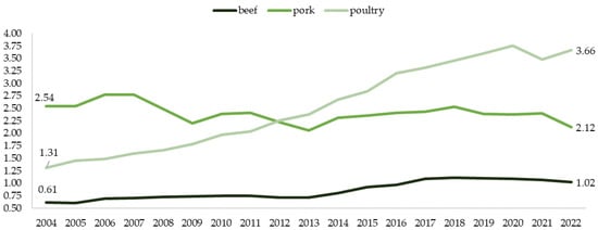 According to Goryńska-Goldmann and Kozera-Kowalska [], news about diseases limits demand. It is intensified by, among others, subsequent episodes of emerging zoosanitary threats publicized by the media, such as ASF or foot-and-mouth disease and Aujeszky’s disease (a viral infectious disease of farm animals and free-living animals, mainly pigs). This information influences temporary restrictions on pork consumption, which are related more to unawareness of the problem than to the actual threat. As Knecht and Środoń [] indicate, pig production becomes unprofitable, as breeders gradually reduce their herds due to the lack of profitability of pig production. In the case of consumers, another important aspect determining purchasing choices is the level of inflation. It is assumed that low and moderate inflation is associated with economic recovery, and high inflation is associated with economic recession []. The level of inflation affects consumers and producers. In the case of significant uncertainty caused by the decline in the value of money, consumers are more likely to choose cheaper products []. Therefore, consumers are more likely to choose other products (e.g., poultry) than pork []. In the case of producers, the trend is the same. The purchasing power of producers decreases; therefore, higher prices of inputs reduce the income of farms [].