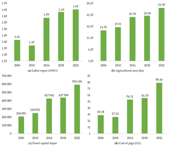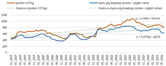 In managing animal production, phenomena related to animal psychology and their diversity should also be considered. The skillful handling of animals and a passion for the work performed by staff or professional practice are of great importance in the entire process of breeding. At the same time, the training of employees and farmers is associated with costs []. Land, labor, and capital are undoubtedly the most important production factors, and their appropriate use can determine the improvement in farms’ financial situations []. However, the most important factor in the profitability of keeping pigs is largely feed availability. The feed market is very closely related to the grain market, so higher prices force feed producers to increase the prices of mixtures, which significantly affects the deterioration of the situation of pig producers [].