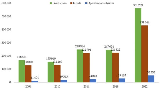 To meet EU food production standards, animal welfare has been improved through legislation [,]. Tightening regulations may contribute to an increase in the level of animal welfare but may also increase production costs. Such action causes some farms to not make changes and go out of business []. Most changes in animal welfare entail high costs, which, in the absence of such requirements in non-European markets, make this production less competitive []. Animal production is characterized by higher labor intensity and material and monetary outlays than in the case of plant production, and animals must be guaranteed appropriate living conditions. Hence, the cost of building a stand is very high. The lowest-paid employees most often staff farms; therefore, as the minimum wage increases, employee remuneration increases []. Additionally, animal products are characterized by high sensitivity to transport because, as Dowgiałło [] states, transporting live animals or fresh meat over long distances often leads to significant losses or deterioration in the quality of products. Slaughterhouses, cold stores, or processing plants should be built near large fattening farms to make losses as small as possible.