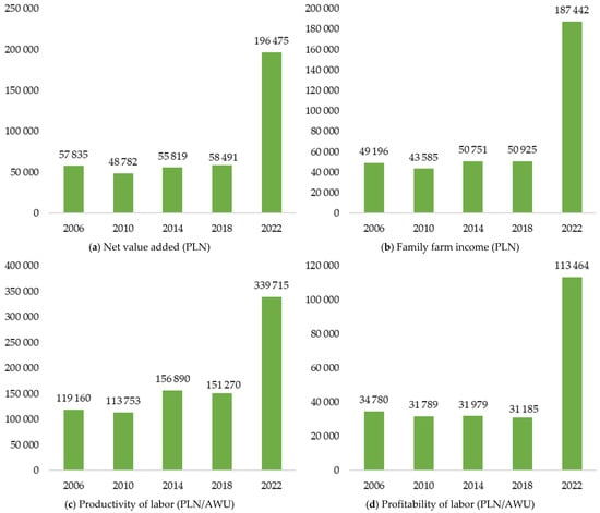 In the next part of the analysis, fundamental indicators concerning the economic situation of pig farms in Poland were determined while considering the resources and relations of production factors (labor, land, and capital), animal density (in LU) per farm and per employee, production and total costs of farms, number of operating subsidies, basic income categories such as the net value added and income from a family farm, and the productivity and profitability of work on pig farms in Poland. Therefore, it was possible not only to determine the situation in the pig market but also to assess the microeconomic situation of farms involved in pig production in Poland.