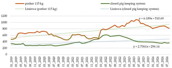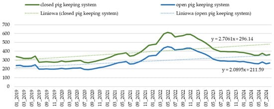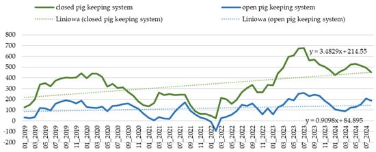 The key part of the study was based on estimating trends in differences in pig profitability depending on the housing system. The analysis focused on the key cost item in pig farming: the feed cost. For this purpose, available statistical and market data on the prices of grains and feed additives were used. Based on the adopted feeding scheme developed by Krzęcio [], feed costs were estimated separately for each production stage (in the closed cycle, these were the costs of feed for sows, piglets, weaners, and piglets, while in the open cycle, they were only for fattening pigs). Feed consumption and cost are strategic determinants influencing the profitability of pig production, and the costs of purchasing feed have a significant share in the costs of producing live pigs. It is assumed that 75% of the total costs generated during production are related to feeding []. At the same time, these costs are seen as the strongest potential for cost reduction during the production of live pigs. In a closed cycle, costs generated as a result of feed consumption are generated from the moment the sow is covered, which extends the period by the length of pregnancy and piglet rearing. Costs generated by sows in terms of feed depend on their phase of the reproductive cycle. During pregnancy, it is important that the feed consumed has an appropriate fiber content. During lactation, their demand depends not only on the number of piglets in the litter but also on the length of lactation. During this period, sows require feed that is cumulated in terms of nutrients. After separation from the nursing sow, piglets are characterized by complex expectations regarding the concentration of feed intake. Taking the above into account, the analysis of feed costs considering the differentiation of the feed intake length in both cycles and all physiological assumptions of pig nutrition allows for the assessment of which pig-keeping system is more profitable [].