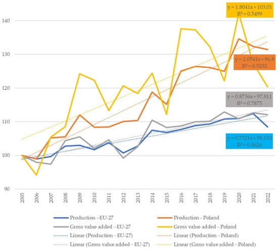 Dynamics of production and value added in agriculture of EU-27 and Poland (real values—2005 = 100). Source: [38]; own calculations. Note: Gross value added is defined as output (at basic prices) minus intermediate consumption (at purchaser prices); intermediate consumption measures the value of the goods and services consumed as inputs (excluding fixed assets) by the process of production. Dashed lines depict the determined trend lines. The text boxes corresponding to the color of the trend line indicate the trend equations and the values of the coefficients of determination, which measure how the regression function fits the empirical data.