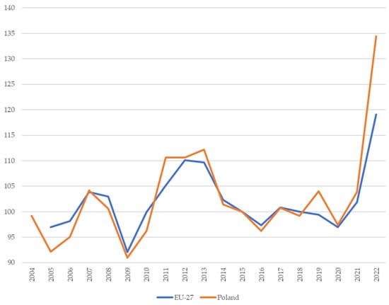 Real selling prices of agricultural products in 2004–2022 (2015 = 100). Source: [38].