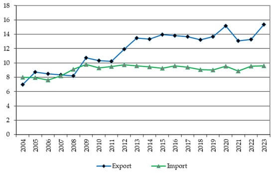Share of agri-food trade in Poland’s total trade in 2004–2023 (%). Source: [1]; own calculations.